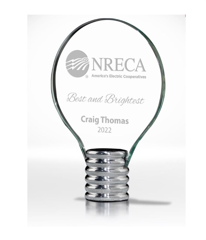 The NRECA Light Bulb award commemorates the brilliant ideas that lead to success. Premium jade glass stop a round polished aluminum base made a thoughtful award. Branded with the NRECA logo.